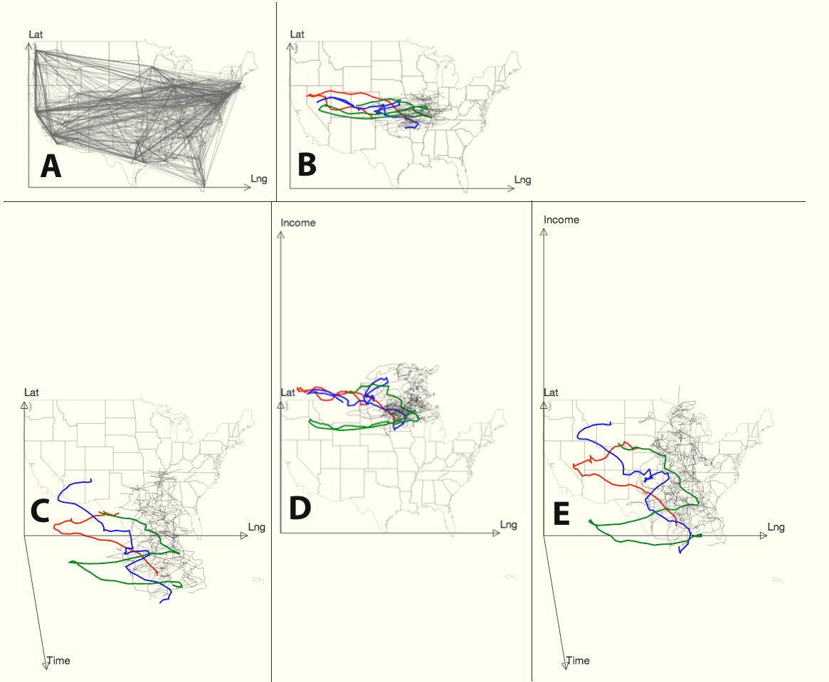 - Caption: Five views of Stretch Plot, revealing multivariate trends amongst a number of trajectories.